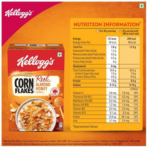 Kellogg’s Almond Honey Cornflakes are not just a breakfast cereal; they’re a versatile meal solution for your busy lifestyle. Enjoy them with chilled milk, almond milk, or even yogurt for a refreshing twist. You can also use them as a delightful topping for desserts, smoothies, or fruit bowls to satisfy your sweet tooth in a healthier way.